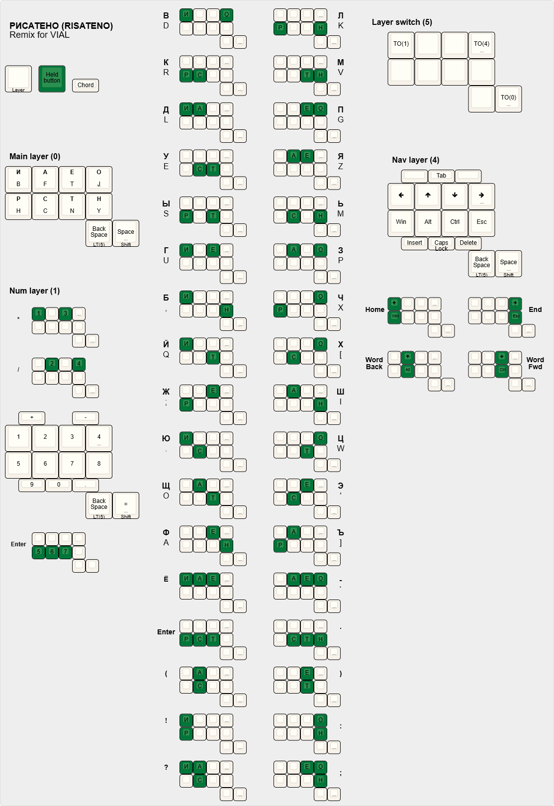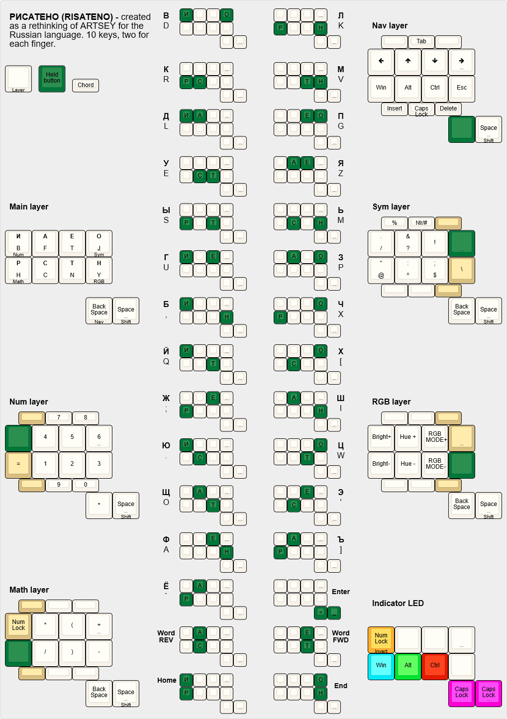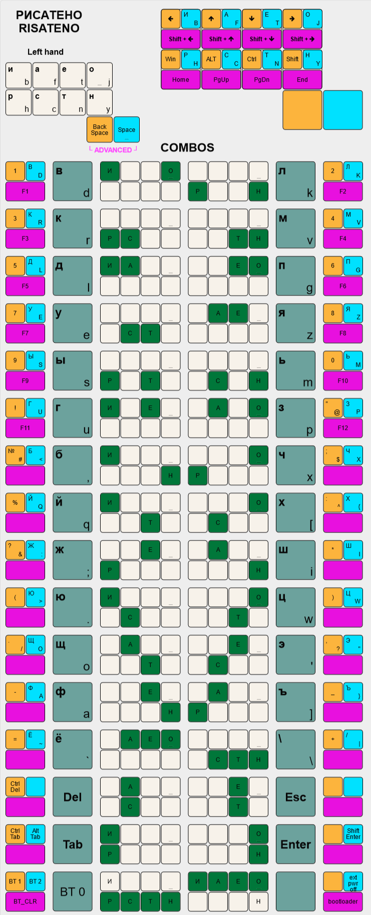 Аккордная клавиатура PNCATEHO (RISATENO, РИСАТЕНО) предназначена для быстрого слепого ввода текста на мобильных устройствах одной рукой.